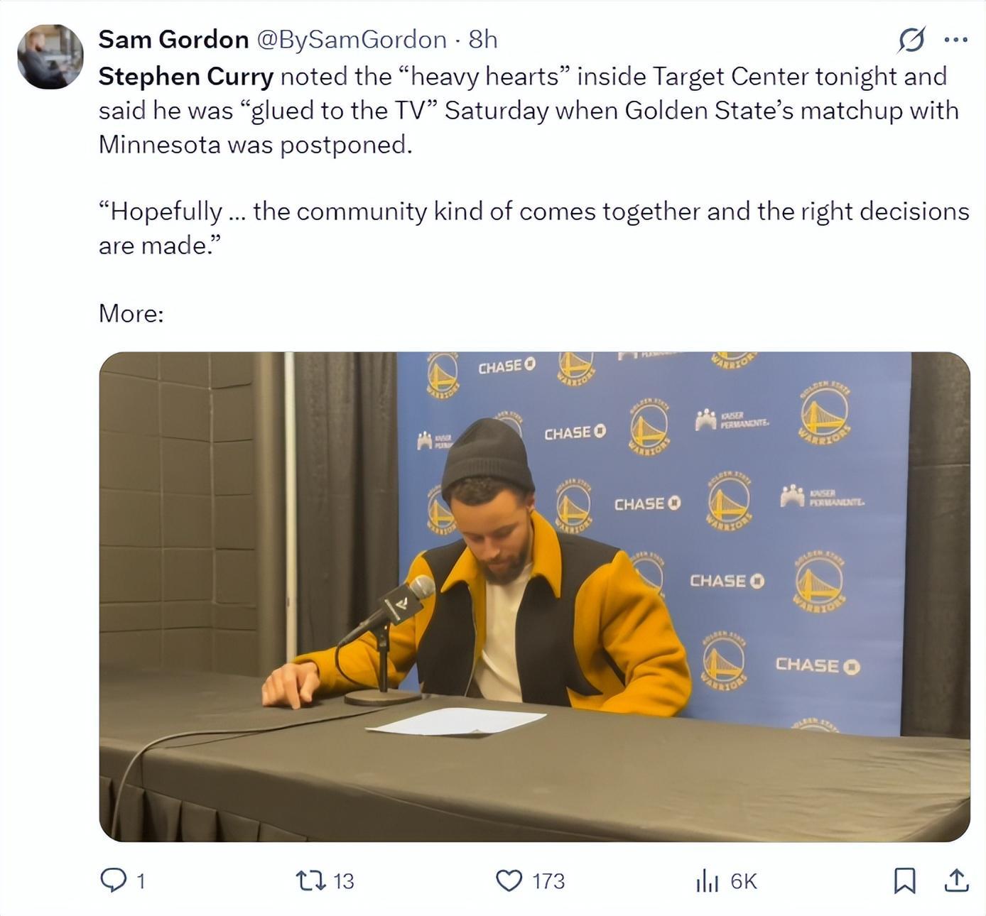 库里在赛后也回答了很多记者的问题,他谈到了自己膝盖的问题,他表示:昨天来到这里训练时就感觉膝盖有些怪怪的,但打完了比赛感觉膝盖还行,我决定利用这个夜晚的休息来恢复它,如果一切顺利的话我计划出战背靠背的第二场。